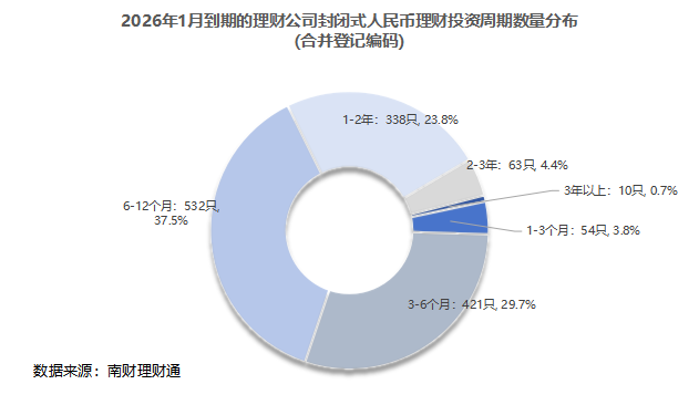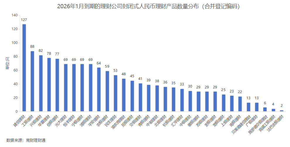 产品数量:据南财理财通数据,2026年1月,32家理财公司合计有1444只(按登记编码核算)封闭式人民币理财产品到期。分投资性质看,固收类、混合类分别有1400只、38只产品到期,权益类、商品及金融衍生品类理财各有5只、1只到期。分募集方式看,公募型产品数量1232只,私募型产品212只。建信理财、工银理财和兴银理财到期产品数量位居前三,建信理财到期数量超百只。