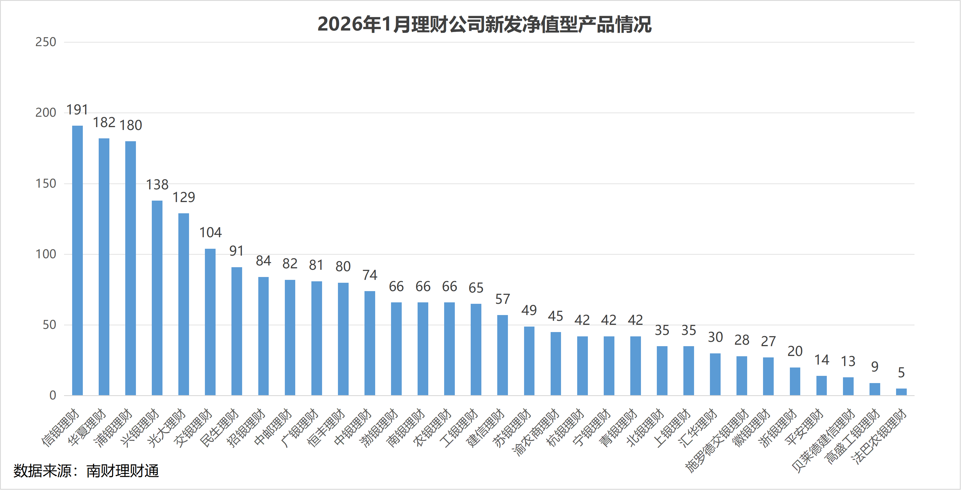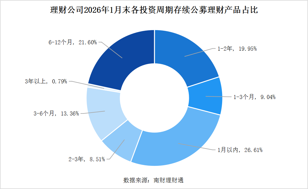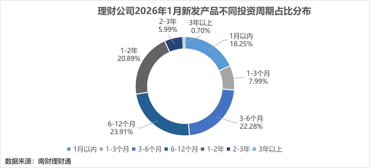 从投资性质上看,理财公司2026年1月新发固收类产品数量占比达到98.0%,混合类产品和权益类产品合计占比2%,其中混合类产品发行了43只,权益类产品发行了1只。