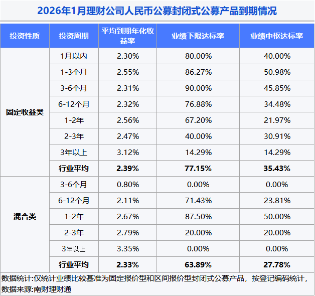 到期情况:2026年1月,32家理财公司合计有1444只(按登记编码核算)封闭式人民币理财产品到期。达标率方面,到期产品业绩下限达标率为76.58%,业绩中枢达标率为35.13%。从到期产品业绩水平看,固定收益类封闭式人民币公募产品年化收益率均值为2.39%,混合类产品为2.33%。