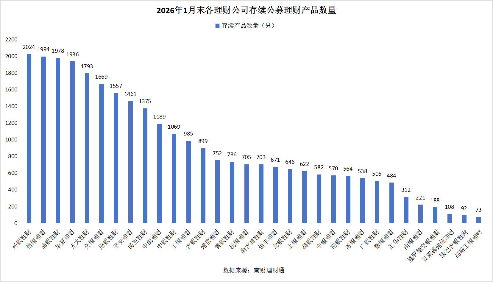 机构分布:兴银理财存续理财产品数量最多,共计2024只;其次是信银理财,浦银理财以及华夏理财,三家机构存续产品数量均超过1900只,分别为1994只、1978只和1936只。法巴农银理财和高盛工银理财存续产品数量均少于100只,其中高盛工银理财仅有73只存续产品,数量较2025年12月末有些许增长。