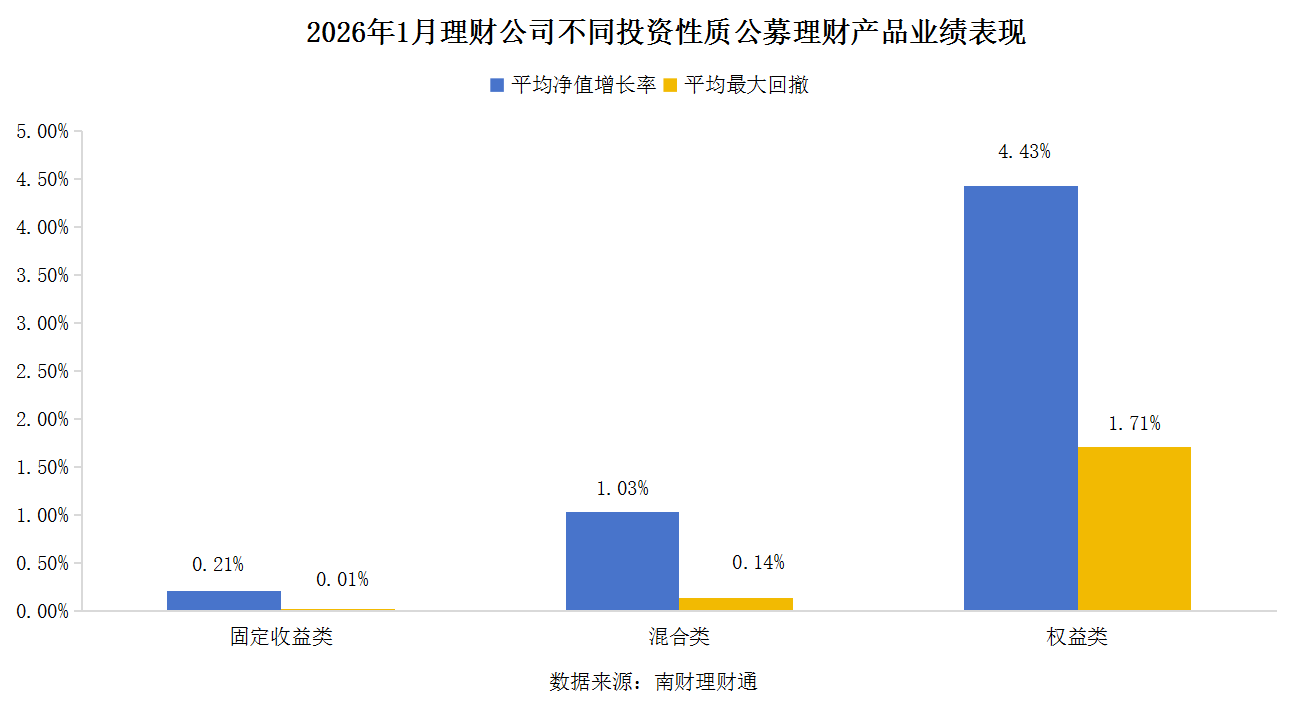 产品收益:2026年1月,A股市场开门红继续带动权益类理财强势领涨,权益类产品平均净值增长率达到4.43%;其次是混合类产品,净值增长率为1.03%;固收类产品收益表现相对温和,均值为0.21%,但其最大回撤为0.01%,近乎“零回撤”,风险水平最低。