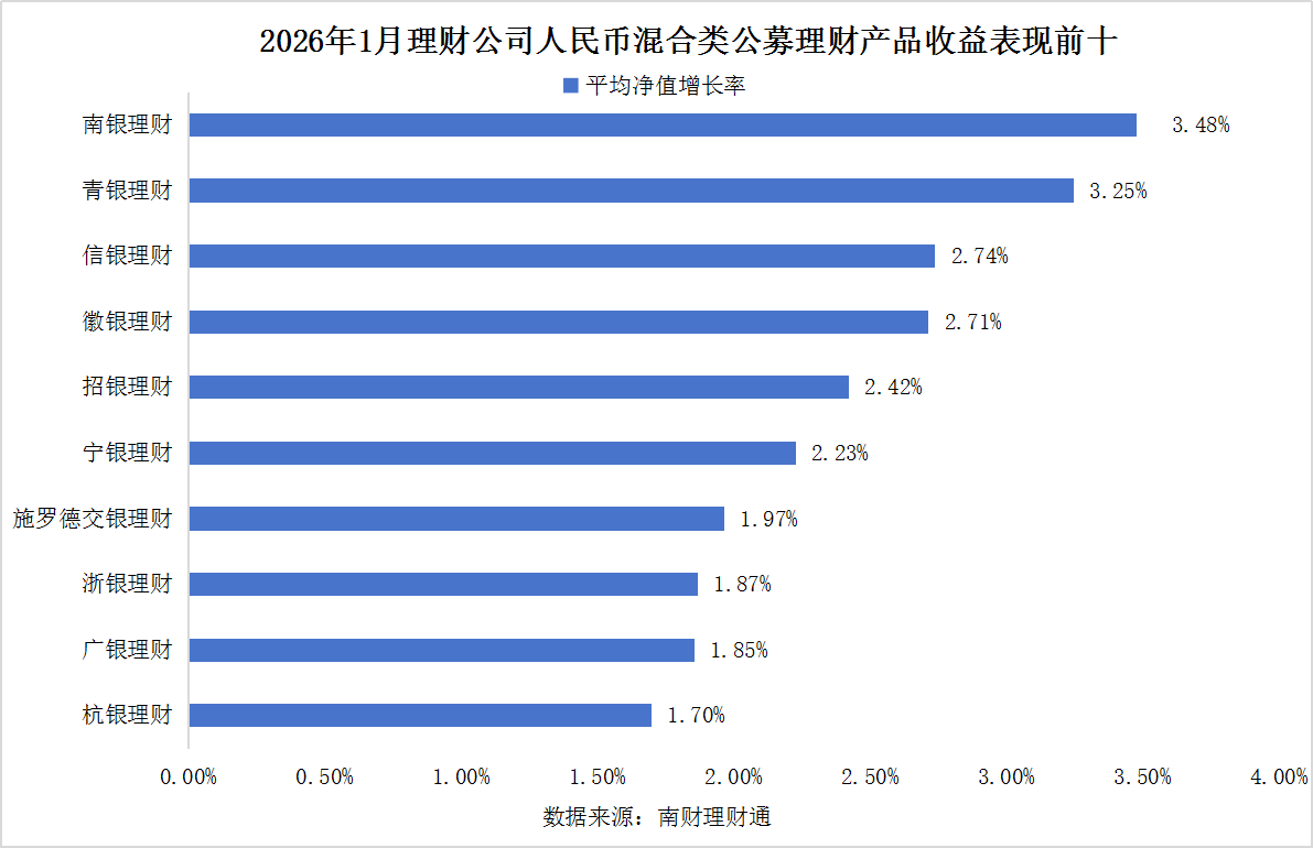 混合类理财方面,南银理财、青银理财以及信银理财开年表现领先,2026年1月平均净值增长率分别为3.48%、3.25%以及2.74%。