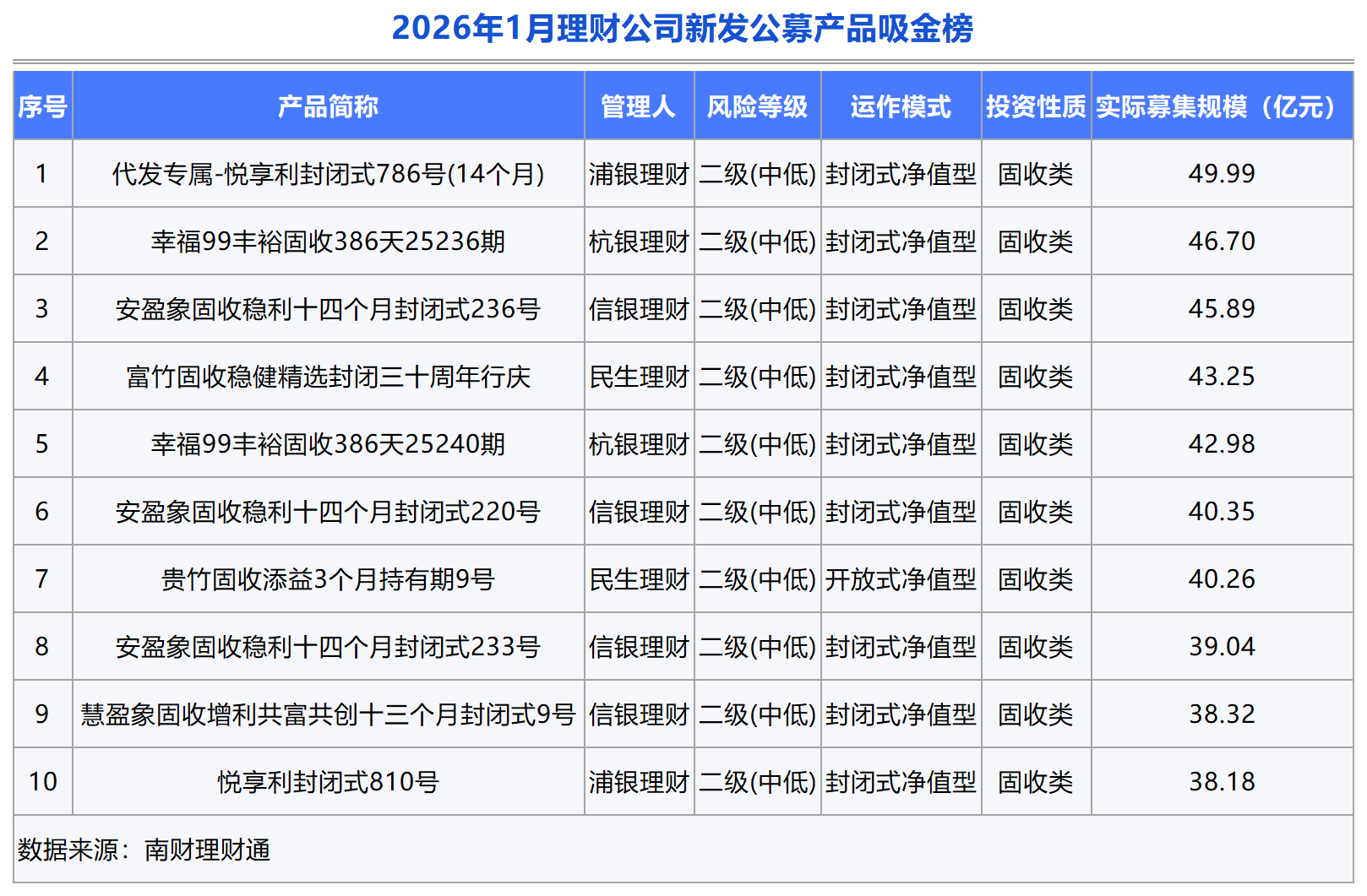单品表现:2026年1月份理财产品募集规模表现平平,没有出现超50亿元甚至100亿元的吸金单品。浦银理财上榜2款产品,其中“代发专属-悦享利封闭式786号(14个月)”排名第一,募集规模为49.99亿元。信银理财安盈象固收稳利系列保持一贯的吸金能力,3只产品进入榜单前十,同时信银理财还有一款慧盈象固收增利系列产品排名第九名。此外,杭银理财、民生理财也各有两款产品上榜。
