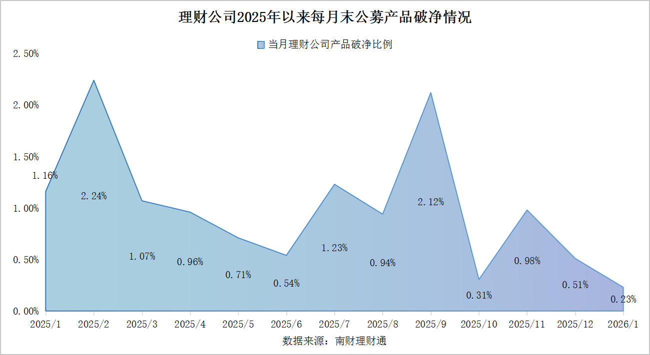 机构表现层面,2026年1月共有3家理财公司破净率突破1%,其中汇华理财破净率超过2%,法巴农银理财和华夏理财破净率控制在1%—1.1%区间。此外,有12家理财公司实现公募产品“零破净”,分别是北银理财、贝莱德建信理财、高盛工银理财、恒丰理财、徽银理财、南银理财、农银理财、青银理财、施罗德交银理财、苏银理财、招银理财、浙银理财。