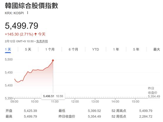 韩国基准股指Kospi指数周四高开高走,截至发稿涨幅已经扩大至2.7%,触及5499.79点的历史高点。