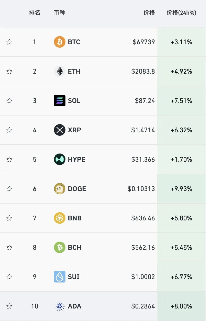 受美国国土安全部从今天(2月14日)起陷入“停摆”消息影响,北京时间2月14日晚,开年暴跌的加密货币全线反弹!比特币价格一度站上70000美元,截至发稿涨幅收窄报69739美元;以太坊涨近5%,现报2083.8美元;狗狗币涨近10%。