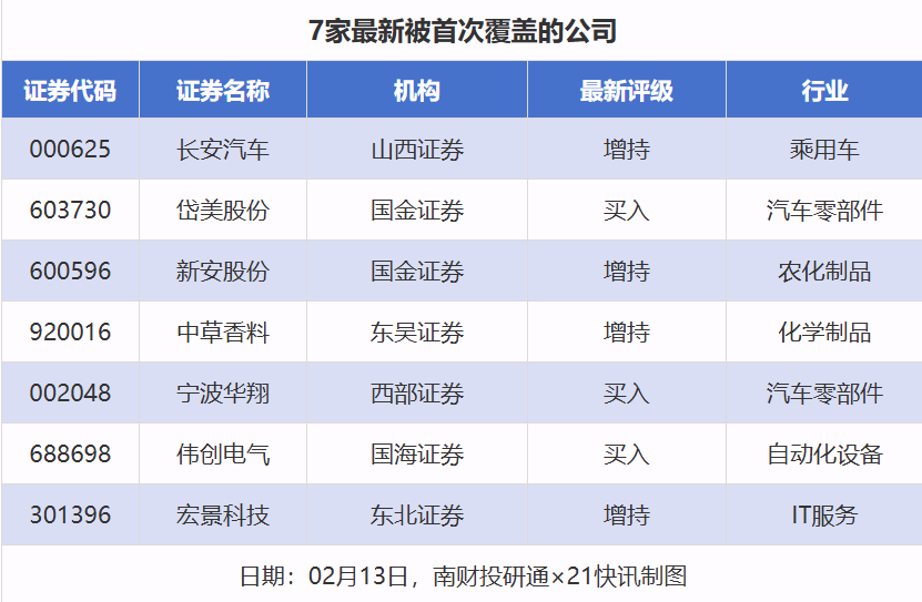 首次覆盖方面,2月13日券商共给出了7次首次覆盖,其中长安汽车获得山西证券给予“增持”评级,岱美股份、新安股份获得国金证券分别给予“买入”“增持”评级,中草香料获得东吴证券给予“增持”评级,宁波华翔获得西部证券给予“买入”评级。