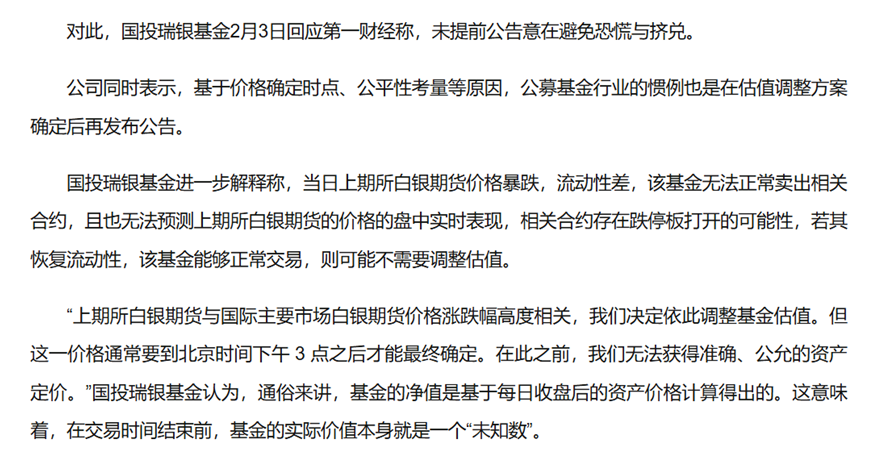 国投瑞银基金在晚间22时左右发布公告称:因国际白银价格出现显著波动,为公允反映基金资产价值,决定自当日(2月2日)起,对基金持有的白银期货合约参考国际市场价格的变动进行估值调整。
