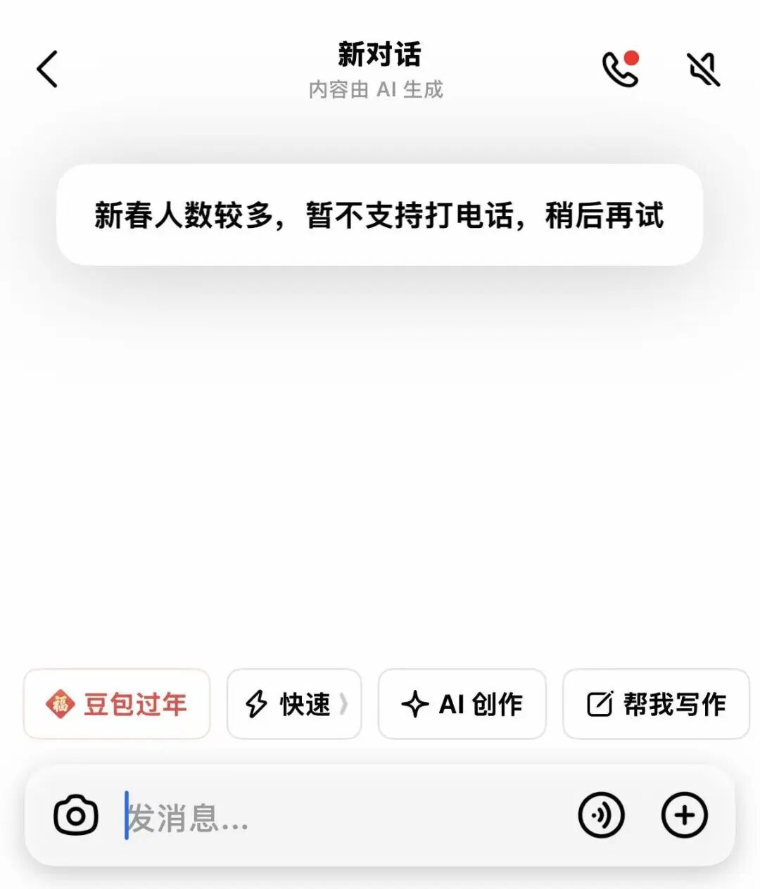 2月16日,21快讯记者发现,豆包APP目前暂停了视频通话功能,页面显示“新春人数较多,暂不支持打电话”,或因算力压力所致。截至发稿,字节跳动方面暂未回应。