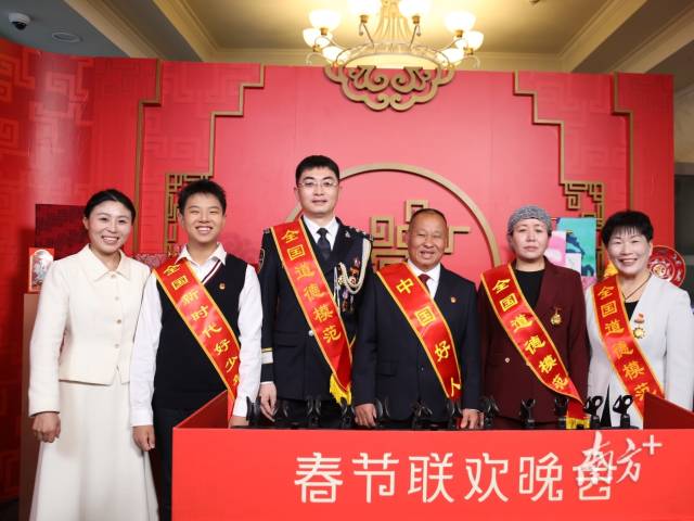 胡东平在央视春晚后台和全国时代楷模、道德模范合影留念。