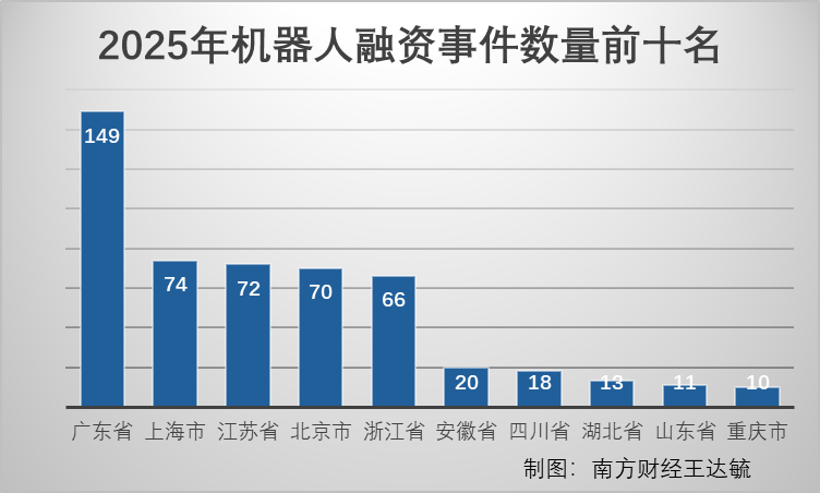 根据投中嘉川CVSource数据,在2025年机器人融资事件数量排名当中,广东以149起位列第一名,上海、江苏、北京、浙江分列二到五名,共同组成了中国机器人的第一梯队。