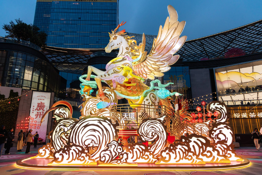 穿过拥挤的人潮,通过四通八达的地下隧道,走进正佳广场,10米高“云腾逐梦”天马灯尤为吸睛,鎏金祥云为鬃、唐三彩为羽,屹立桃林之间,寓意吉祥如意,这正是广州天河路商圈的新年一景。