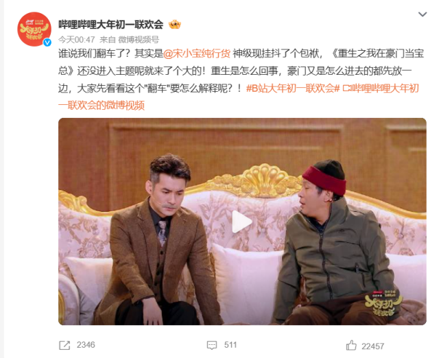 对此,B站春晚将这一段发了出来,并配文:“没错,我们把舞台事故发出来了。爆笑到无人分辨是舞台事故还是纯包袱!”