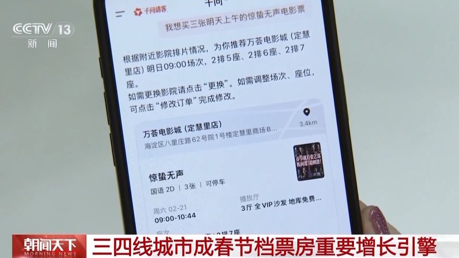 如今,在春节假期看电影已经成为越来越多基层群众的新年俗。今年春节档,全国多座三、四线城市票房表现都很突出,成为拉动整体票房的核心动力。据票务平台数据显示,三、四线城市已连续三年成为春节档票房的绝对主力。除了影片内容更贴合地域偏好等传统原因,今年春节档,AI购票的全新方式也让购票更加便捷。今年春节档,山东滨州、辽宁阜新、内蒙古赤峰等三、四线城市影院跻身全国影院票房榜前六名。随着我国电影市场持续向纵深发展,“下沉”市场在春节档展现出了不俗的消费潜力。
