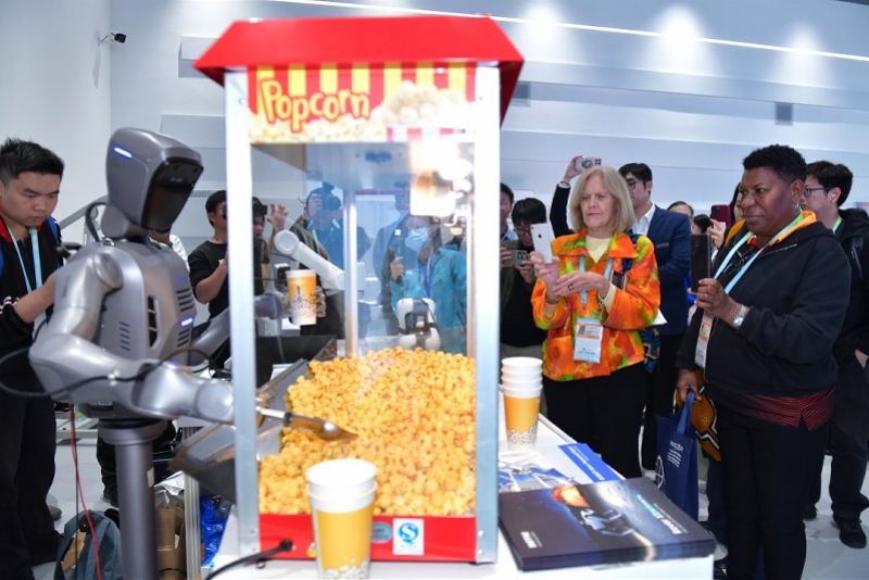 与会嘉宾体验自助售卖爆米花的人形机器人。受访者供图