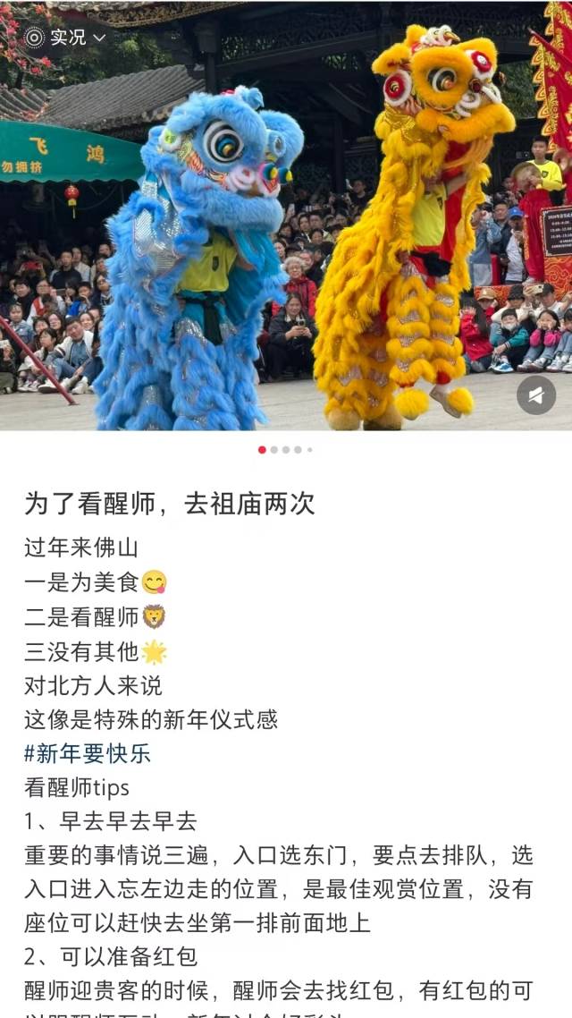 看醒狮、祈好运,春节到祖庙参观祈福是很多佛山人的传统。这份浓厚的岭南年味,使祖庙成为游客来佛山的必选打卡地,更吸引了大批游客专程前来体验。有网友在小红书上分享:“为了看醒狮去祖庙两次,对北方人来说,这像是特殊的新年仪式感。”