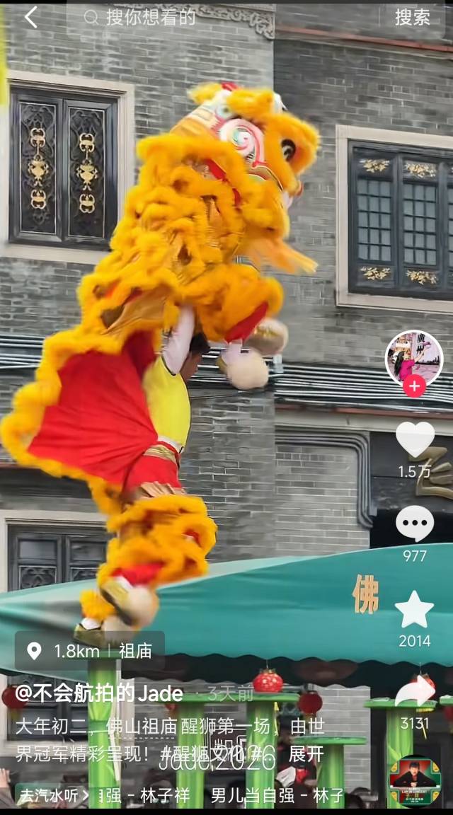 抖音上祖庙醒狮表演热度飙升。 抖音截图