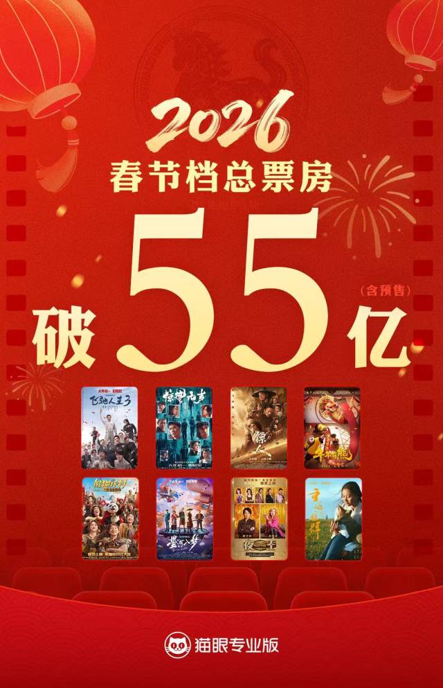 据猫眼专业版数据,截至2月23日下午,2026年春节档档期总票房突破55亿元,《飞驰人生3》《惊蛰无声》《镖人:风起大漠》分列票房榜前三位。