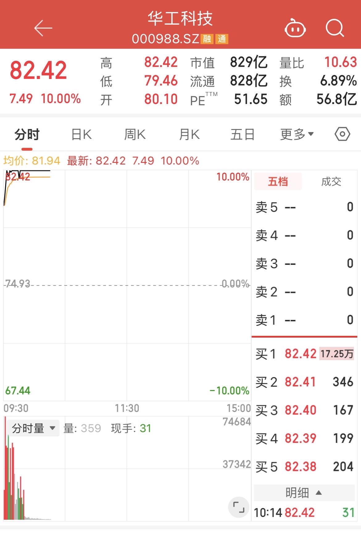 2月24日,光模块龙头华工科技(000988.SZ)开盘后快速拉升,迅速封死涨停板。截至当日10时14分,公司股价报82.42元/股,涨停板上封单超17万手,总市值攀升至829亿元。