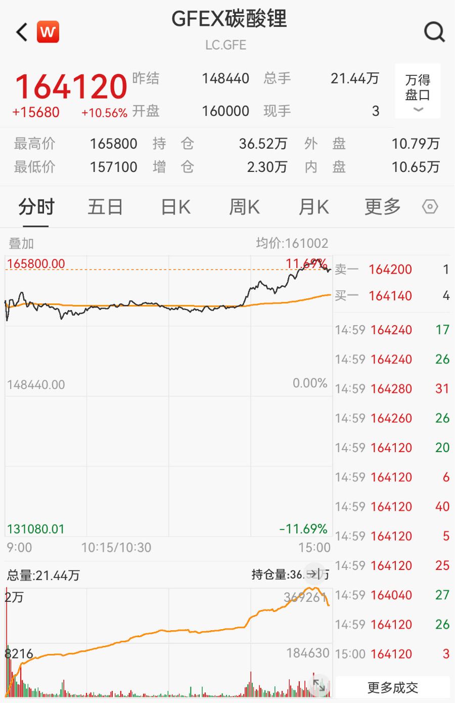 农历新年后的首个交易日,碳酸锂市场迎来强势“开门红”。2月24日,碳酸锂主力期货合约开盘即跳空高开,盘中最高触及165800元/吨,最高涨幅超11%,截至收盘报164120元/吨,涨幅达10.56%,创上市以来最大单日涨幅。