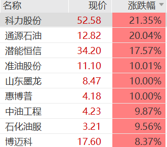 油气股全线大涨,通源石油、准油股份、中曼石油、山东墨龙、洲际油气等纷纷涨停。消息面上,WTI原油期货3月合约收涨1.9%,布伦特原油期货4月合约收涨1.86%。国内成品油新一轮调价窗口将于2月24日24时开启。据中新经纬综合机构观点,国内成品油价格将“三连涨”。