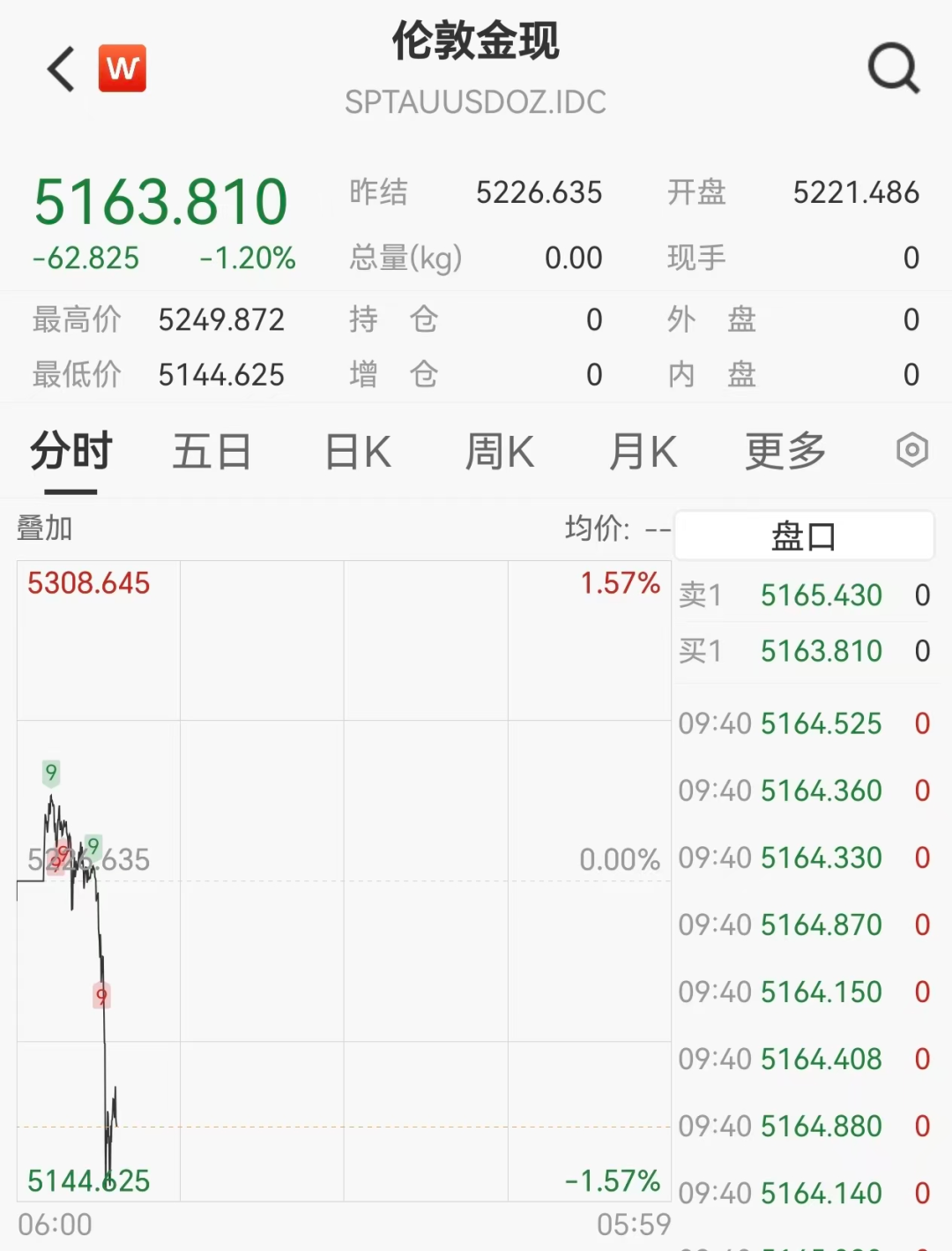 国际金银大涨后跳水。现货黄金一度冲高,目前失守5170美元/盎司,日内跌约1.5%;现货白银跌超3%。