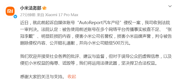 2月24日,小米法务部发文称,近日,就此前起诉自媒体账号“AutoReport汽车产经”侵权一案,我司收到法院一审判决。