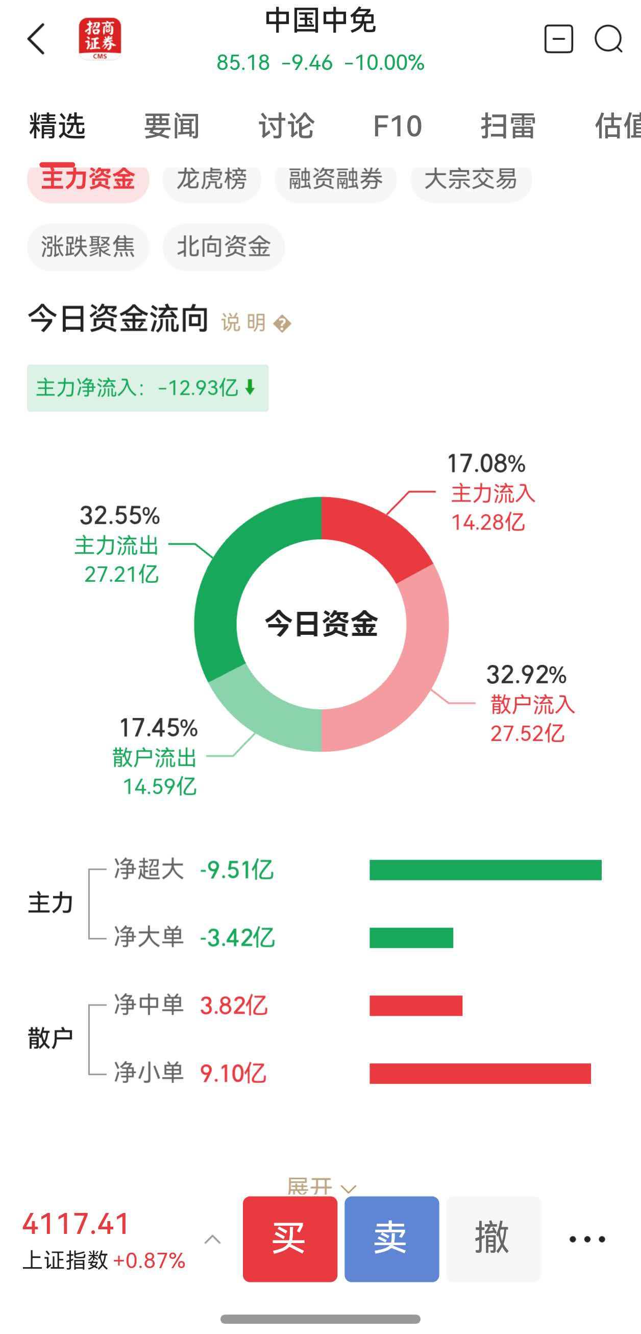 资本市场上午9点半开盘,但很快9点33分55秒,在大单压盘和主力卖出的联合操作下,中国中免就已接近跌停,9点36分28秒,封跌停板。尽管随后有买盘护驾,短暂打开跌停,但最终于9点57分58秒死死封住跌停板。当日成交额达41.8亿元,主力净流出12.93亿元。