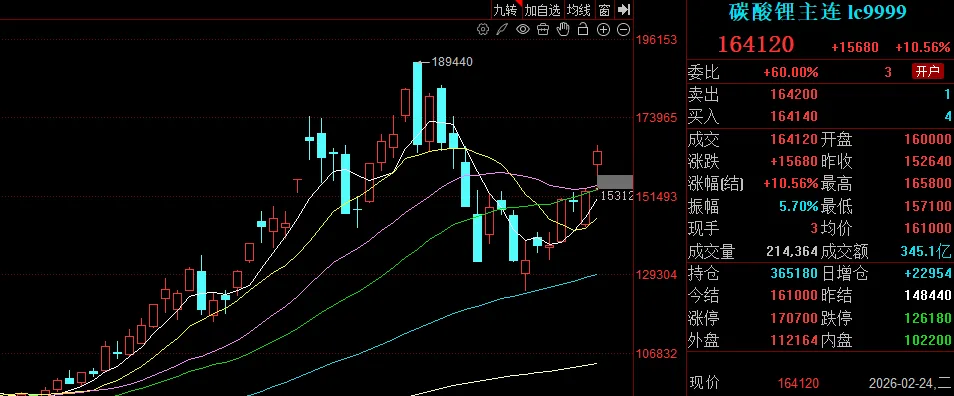 2月24日,碳酸锂主力期货合约开盘即跳空高开,盘中最高触及165800元/吨,最高涨幅超11%,截至收盘报164120元/吨,涨幅达10.56%,创上市以来最大单日涨幅。