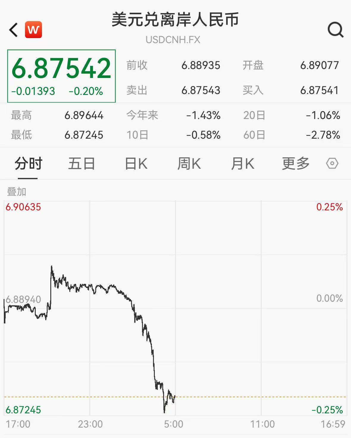 2月24日, 离岸人民币对美元汇率 飙升超100点,盘中一度升至6.8760,截至下午17:55,离岸人民币汇率报6.8754。