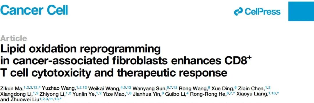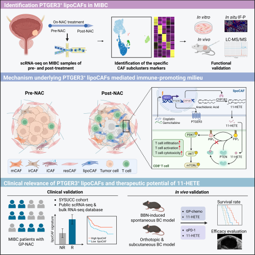 2026 年 2 月 12 日,中山大学肿瘤防治中心刘卓炜、马梓坤、梁晓雨团队联合暨南大学何蓉蓉团队,在Cancer Cell 发表题为:癌相关成纤维细胞中的脂质氧化重编程增强 CD8⁺ T 细胞的细胞毒性及治疗反应的研究论文。研究在对化疗敏感的膀胱癌组织中鉴定了一类以脂质代谢及脂质氧化显著增强为特征的癌相关成纤维细胞亚群(lipo-CAF),阐明了化疗与抗肿瘤免疫应答之间的协同关系提供了重要理论依据,也为基于肿瘤微环境代谢特征的联合治疗策略提供了新的潜在干预策略。