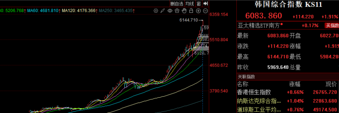 韩国综合指数(KOSPI)首次站上6000点大关,这主要得益于全球对存储芯片需求的激增,推动了韩国两大芯片巨头三星电子和SK海力士的股价。