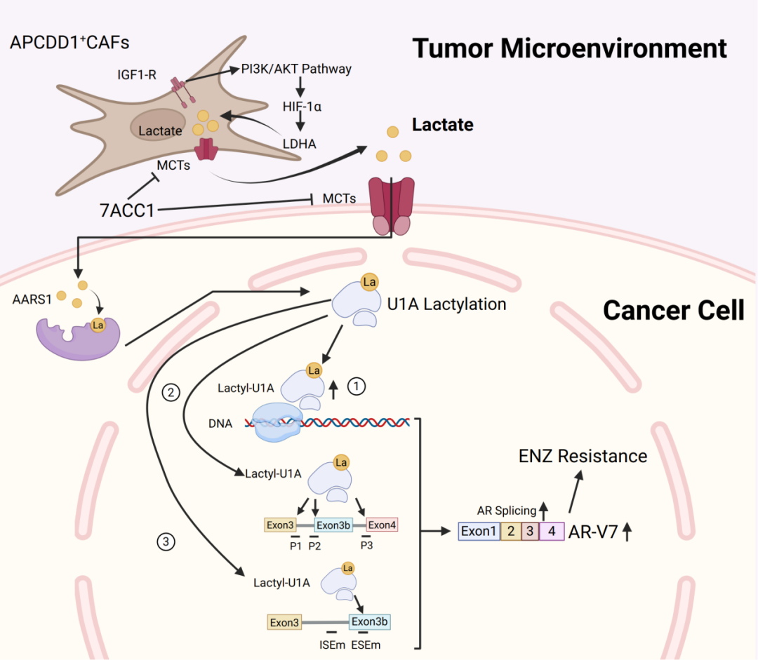 前列腺癌是全球男性高发的恶性肿瘤,近年来我国发病率呈上行趋势。不同于欧美人群,我国人群前列腺癌初诊转移占比较高,以恩杂鲁胺(ENZ)为代表的等新型内分泌治疗药物,是晚期前列腺癌的重要治疗手段。然而,几乎所有患者最终都会出现耐药,疾病进展为去势抵抗性前列腺癌(CRPC),治疗选择极为有限,预后很差。其中,肿瘤细胞通过“选择性剪接”产生缺失药物靶点的雄激素受体变异体(如AR-V7),是公认的关键耐药机制。但驱动这一剪接事件的肿瘤微环境因素,此前尚不明确。