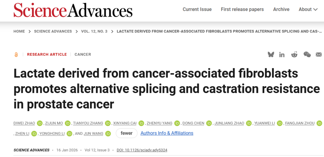2026年1月16日,中山大学肿瘤防治中心泌尿外科李永红、王骏团队在《科学·进展》(Science Advances)上发表了题为“肿瘤相关成纤维细胞来源的乳酸促进前列腺癌可变剪切及去势抵抗”的研究成果。该研究首次揭示了肿瘤微环境中的一类特殊癌症相关成纤维细胞(CAFs),能够通过分泌乳酸“遥控”前列腺癌细胞,调控可变剪切及内分泌治疗耐药性。