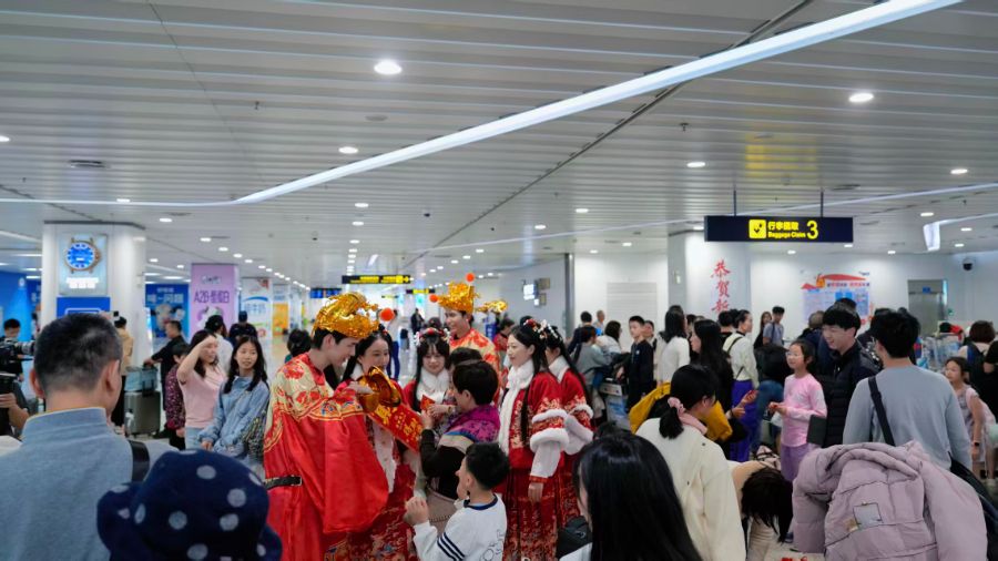 南航在广州白云国际机场二号航站楼值机区、行李提取区开展新春主题活动,设置移动服务台,在亲和精细服务中融入春节互动体验,通过邀请旅客写“福”字、春联、年味打卡、福运抽签等,营造新春佳节浓厚氛围。