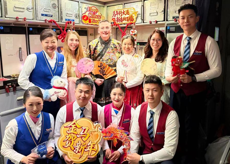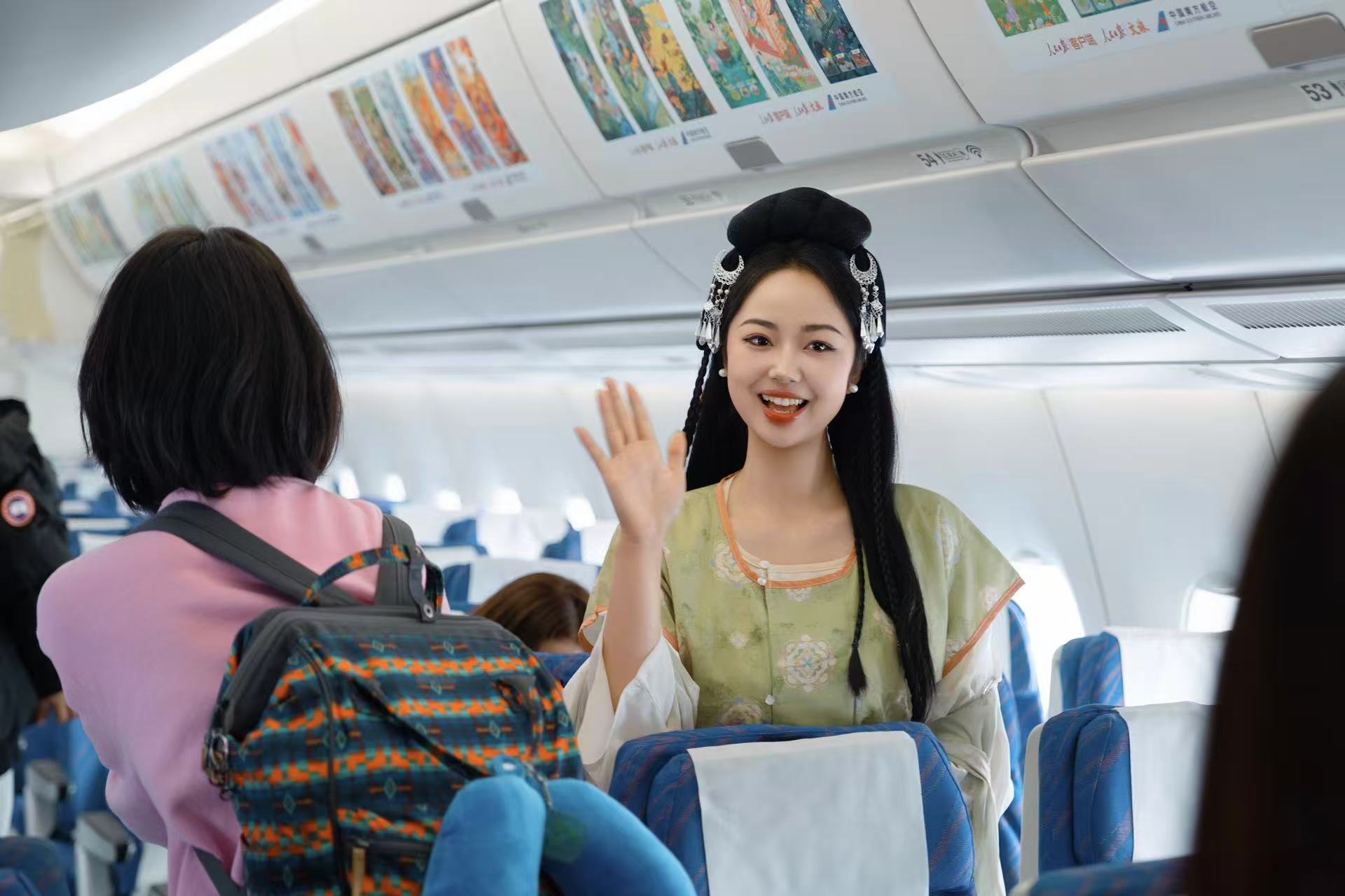 春节期间,南航在15个国际航班上开展“木棉新禧”暨“云端中国年 幸福新航程”主题航班系列活动,客舱内装饰二十四节气海报、福字贴、红灯笼,处处洋溢着喜庆祥和的节日氛围。其中,在广州-阿姆斯特丹航班上展示汉服雅韵,邀请外籍旅客沉浸式感受中华优秀传统文化的独特韵味。在广州-伦敦航班上,乘务员向旅客们展示团扇、生肖玩偶,用双语讲述年俗故事。在广州-奥克兰航班上,邀请中外旅客当“财神”,为航班上的旅客送上节日祝福。