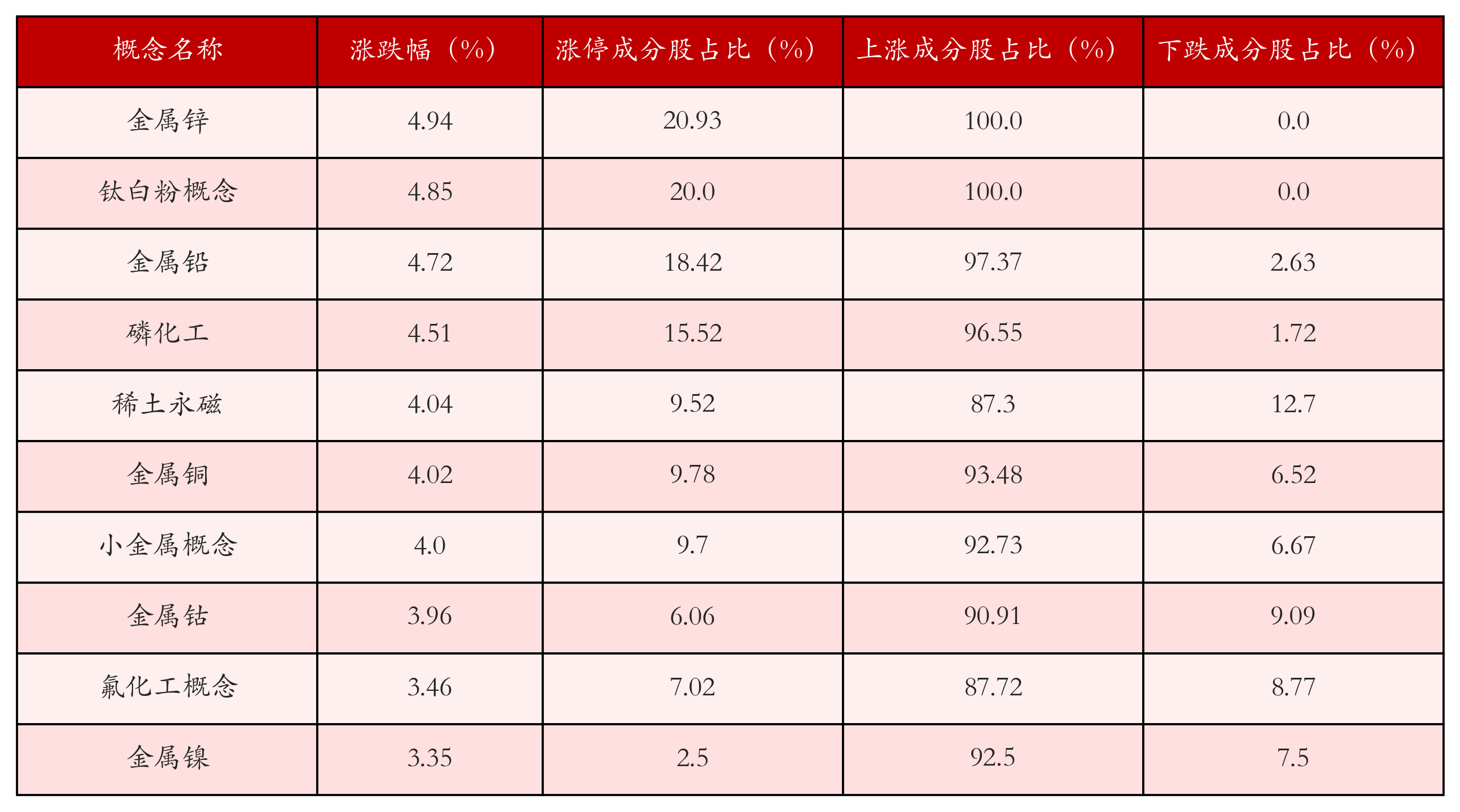 根据A股概念涨跌幅与所对应的股票池综合分析,涨幅靠前的三个概念板块分别为:金属锌、钛白粉概念与金属铅。排名前10位的概念板块相关数据见下表: