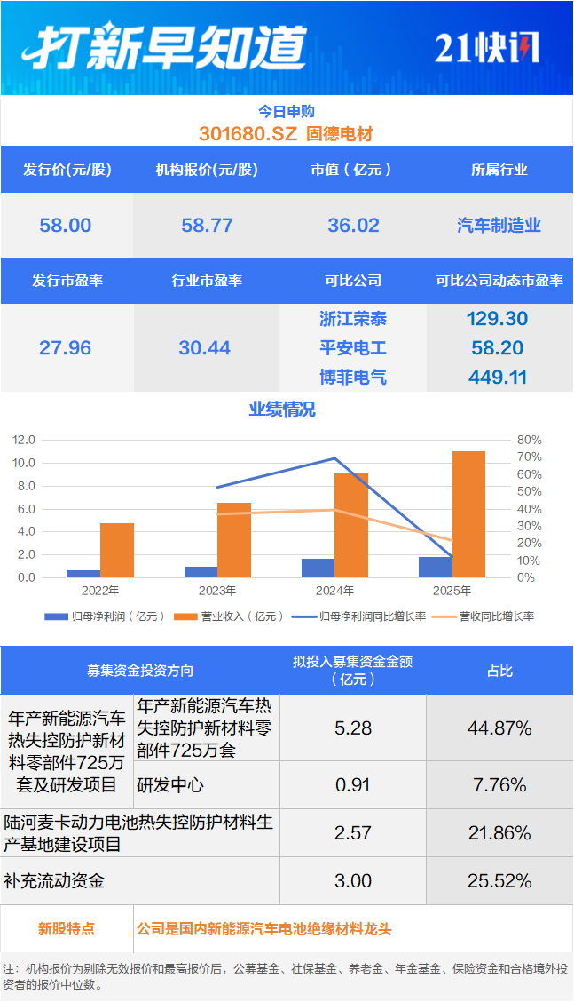 2月25日,可申购创业板的固德电材(301680.SZ)。该公司主营业务为新能源汽车动力电池热失控防护零部件及电力电工绝缘产品的研发、生产与销售。