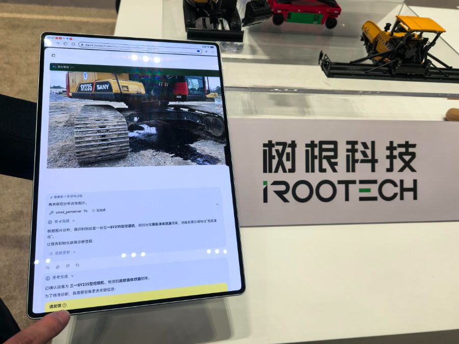 “根据图片分析,我识别到这是一台三一SY235型挖掘机,底部出现黑色液体泄漏现象,且地面有警示牌标注‘危险溢出’。”当一台挖掘机出现故障,树根互联股份有限公司(以下简称“树根科技”)的设备维修助手智能体能迅速识别问题并给出诊断结果,像个经验丰富的“工业医生”。