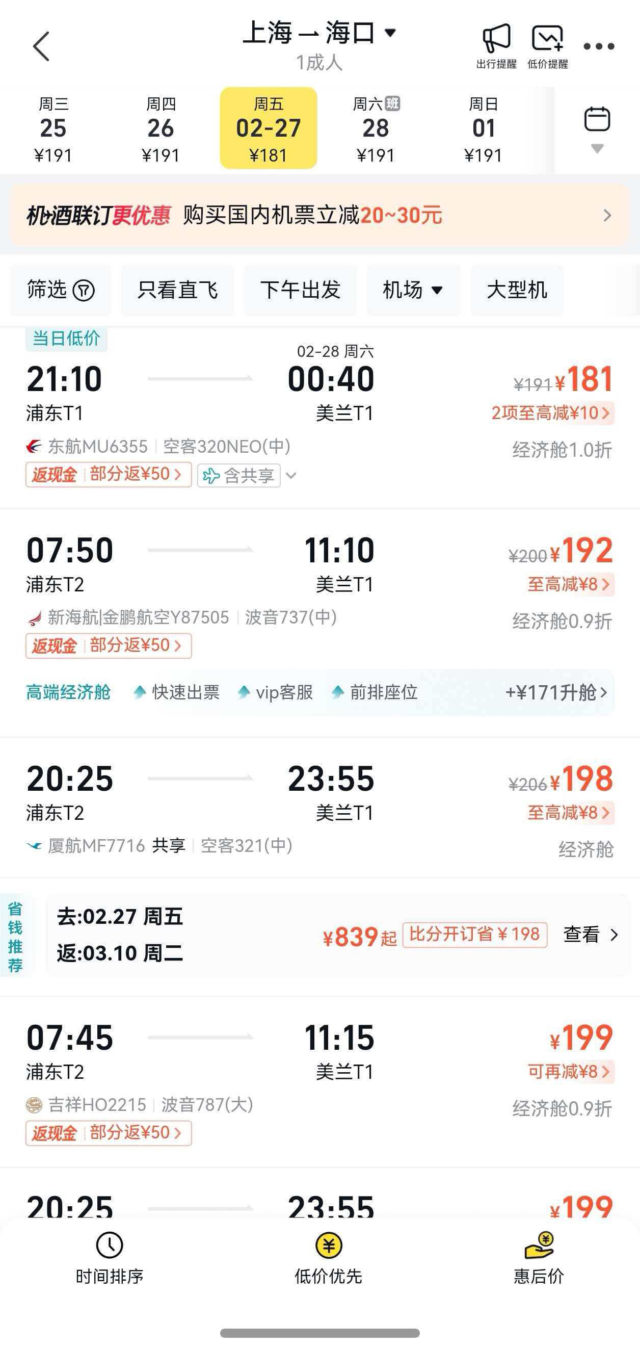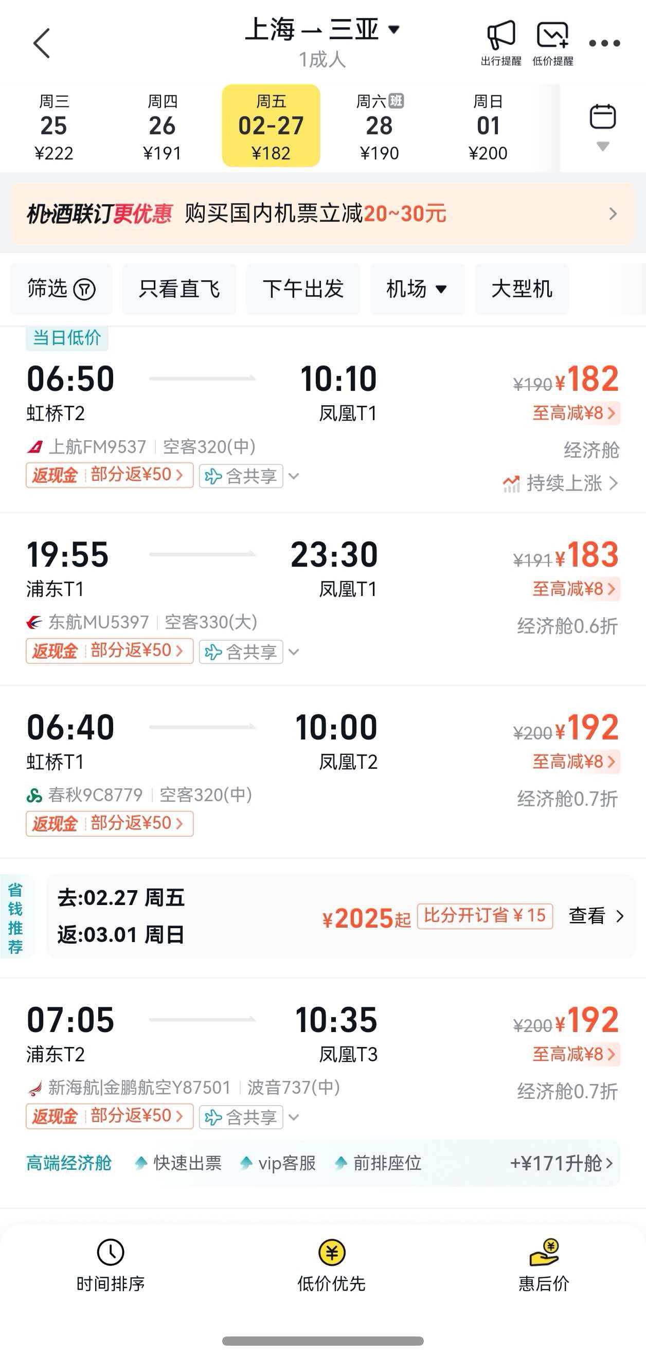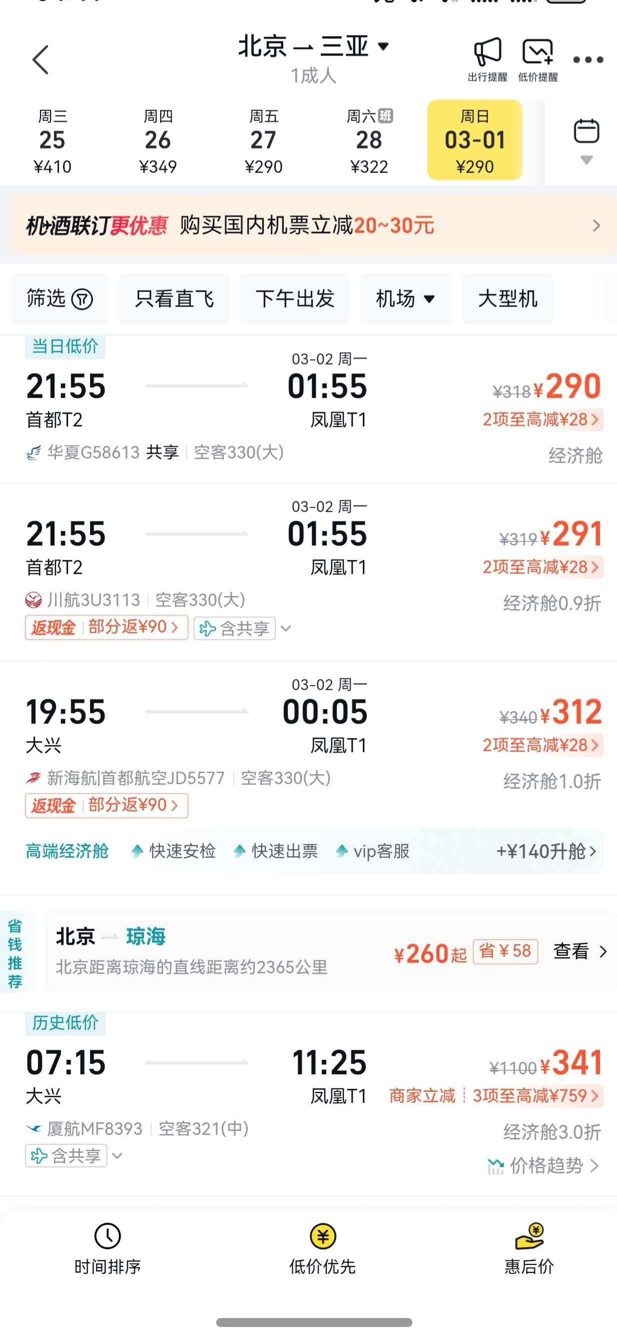 节后出行机票大跳水了,上海到海口三亚的机票都不到200元了。