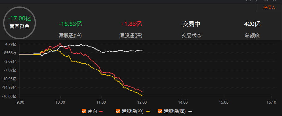 早盘南向资金净卖出17亿港元,其中沪股通净卖出18.83亿港元,深股通净买入1.83亿港元。