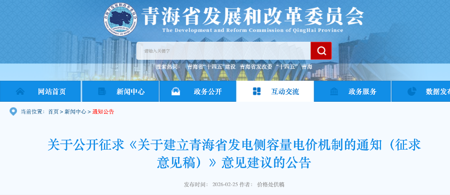 在国家政策明确方向之后,地方的发电侧容量电价机制也在逐步落地。2月25日,青海省发展和改革委员会发布《关于建立青海省发电侧容量电价机制的通知(征求意见稿)》(以下简称《征求意见稿》)。