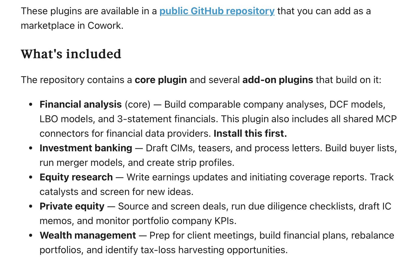Anthropic介绍称,这套代码库共有五款插件,分别为财务分析(生产DCF 、LBO 模型)、投资银行(起草推介摘要、流程函件等)、股票研究(撰写研报、筛选新标的)、私募股权(挖掘和筛选交易、生成尽职调查清单)、财富管理(筹备客户会议、制定财务规划)等。