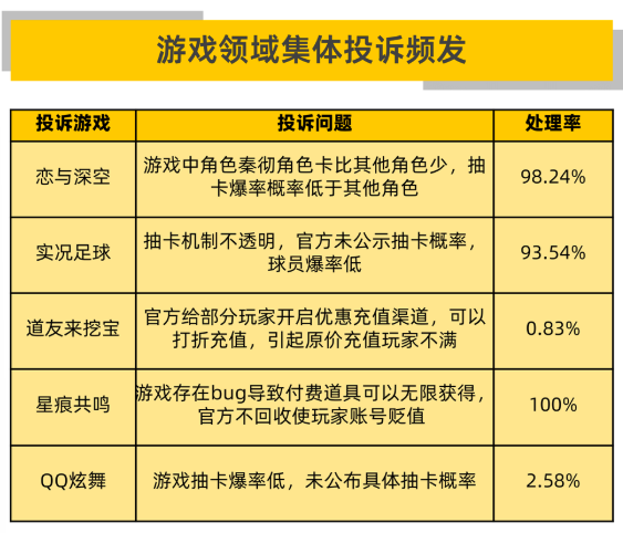 此外,投诉量较高的游戏问题还包括网易《实况足球》抽卡机制不透明、雷霆游戏《道友来挖宝》官方给部分玩家开启优惠充值引起原充值玩家不满等。