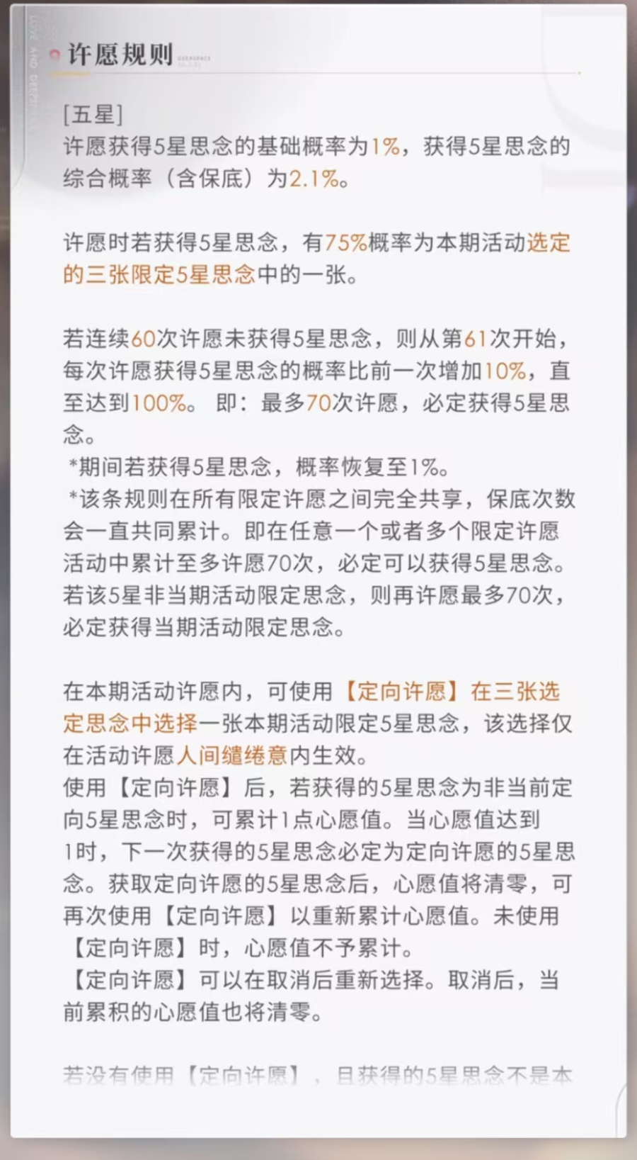 记者查阅《恋与深空》游戏内抽卡(“许愿”)规则相关公示内容发现,其确实仅公布了不同星级卡片的抽取和保底概率,而并未细化到具体卡片、角色的抽取概率。