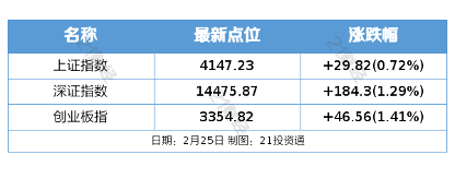 2月25日,市场高开高走,午后小幅回落后再度拉升,创业板指、深成指均涨超1%。截至收盘,沪指涨0.72%,深成指涨1.29%,创业板指涨1.41%。沪深两市成交额2.46万亿,较上一个交易日放量2605亿。
