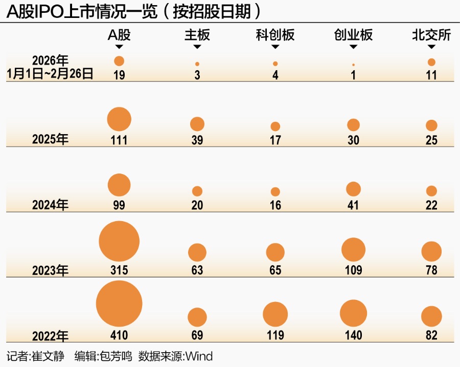 如今,IPO撤回潮已经过去,每月虽仍有企业撤回材料,但数量已经仅为撤回高峰时的零头。2023年全年,A股撤材料的IPO企业达到237家;2024年,这一数字升至401家,达到峰值;2025年起明显减少,全年仅有88家;截至2月26日,2026年以来的57天中,撤回的IPO企业更是仅有6家。