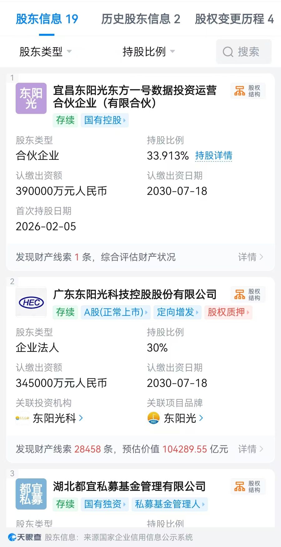 根据天眼查,交易落地之后,东阳光最终获得了“东数一号”30%的持股份额,位居其第二大股东。“东数一号”的第一大股东为宜昌东阳光东方一号数据运营合伙企业(有限合伙)(以下简称“东阳光东方一号”),持股比例为 33.91%。