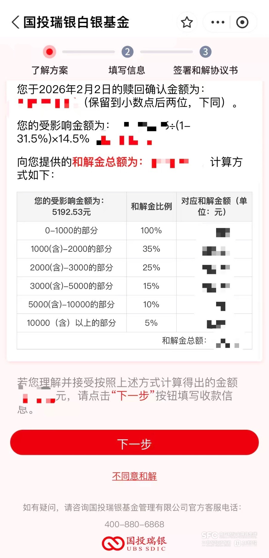 整个流程分四步:身份验证、了解和解方案、填写银行卡及联系方式、确认并签署《和解协议》。如果不同意和解,页面会提示:仍可根据基金合同约定通过仲裁等法律途径解决争议。如果不属于方案适用对象,页面则直接显示:“感谢您的关注,您不属于本次方案适用范围!”