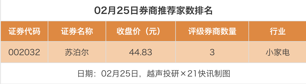 从券商推荐家数来看,2月25日有21家上市公司得到券商推荐,其中苏泊尔获得3家推荐,誉衡药业、渤海租赁等获得1家推荐。